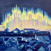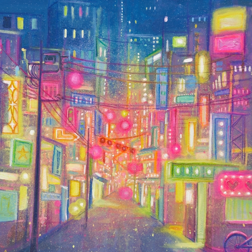 This painting was challenging due to the depictions of neon lights, and all of the lights collecting together. Many times through the process I would add another glaze of color thinking it would be sufficient, only to find it still was not as bold as I wanted. There was a push and pull between adding enough darkness to let the light shine and having enough light to depict my vision. Careful use of many techniques including some sprayed paint come together for this symphony of color.