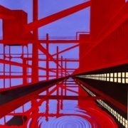 The bold red forms stretch across the canvas like scaffolding from a memory, intersecting and overlapping to create a sense of both structure and disorientation. The cool, reflective water below introduces a moment of quiet—disrupting the rigidity with a single ripple that radiates outward. That ripple became central to the piece: a symbol of impact, echo, and transformation.