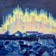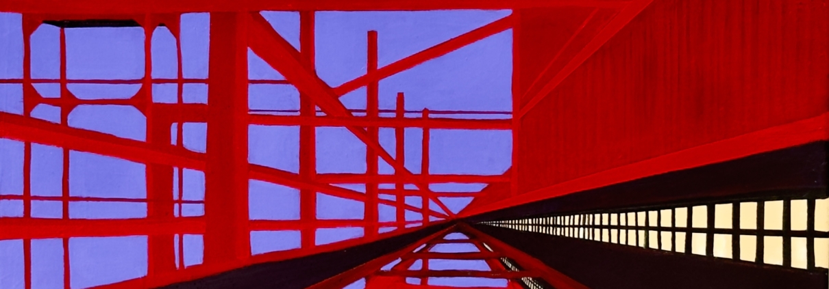 Visually, the painting plays with perspective, symmetry, and light, leading the viewer down a corridor that feels both infinite and dreamlike. It’s rooted in Americana, evoking the spirit of industrial landscapes and the emotional weight they carry.